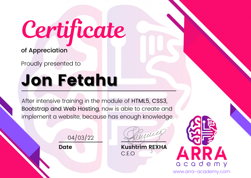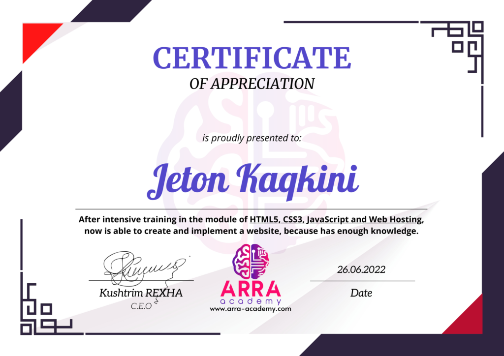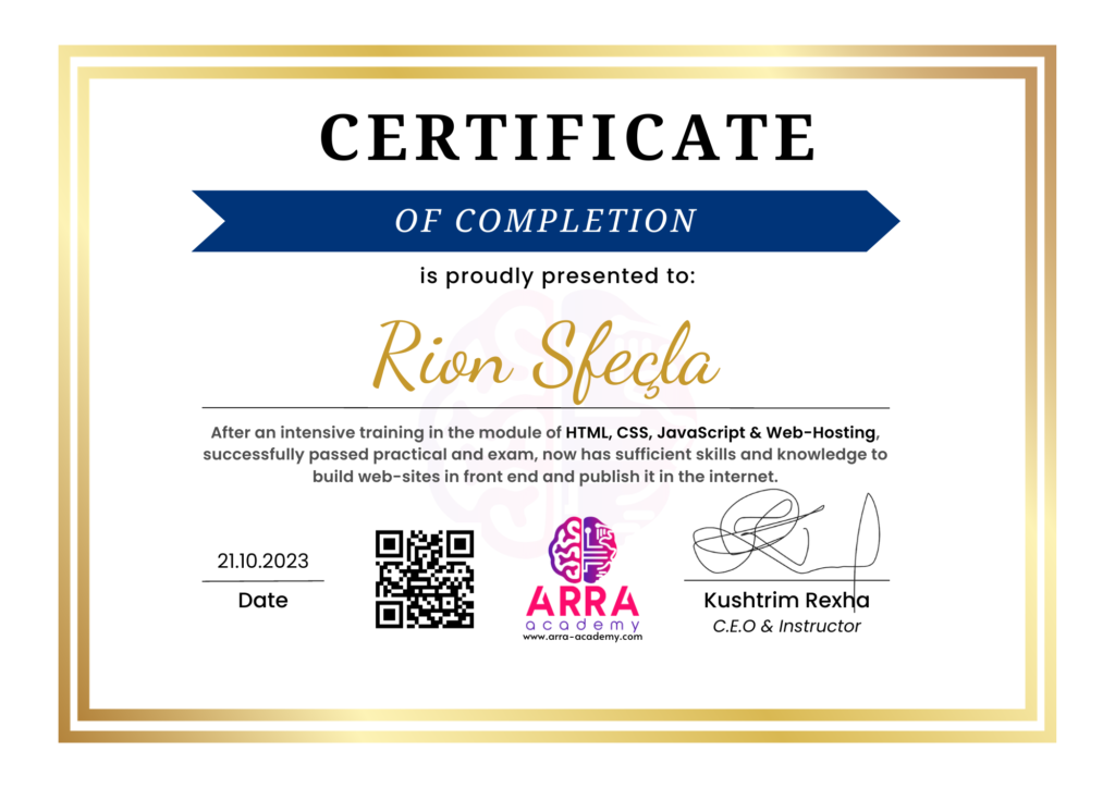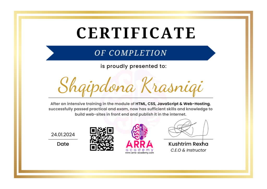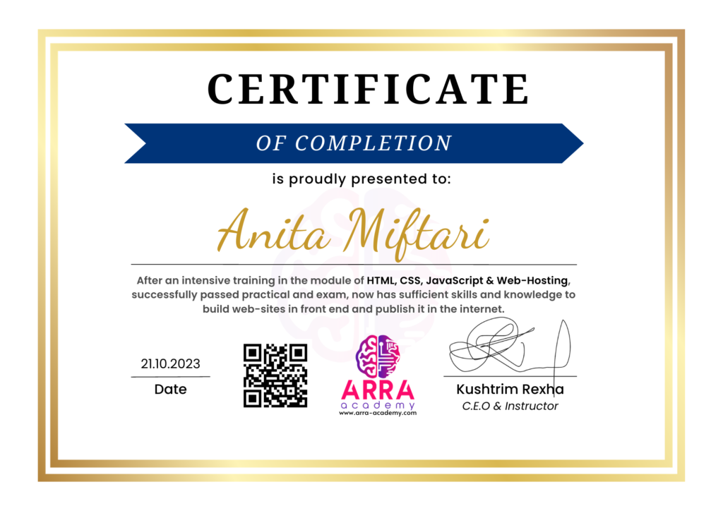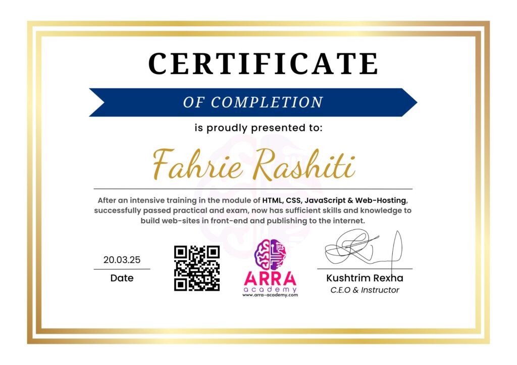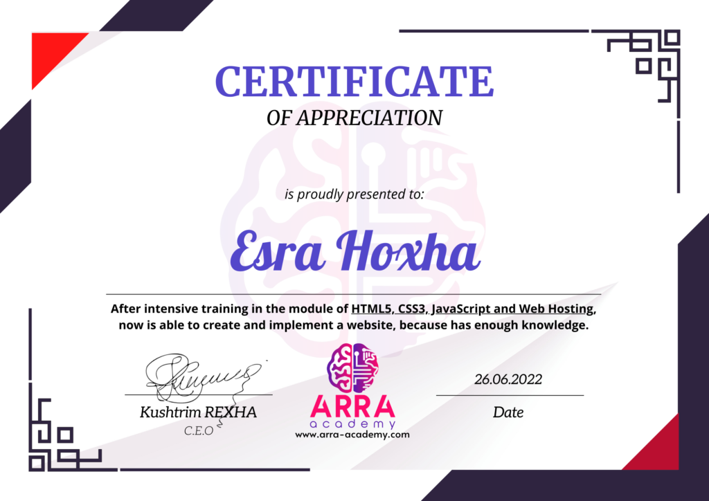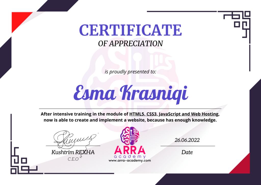 Çertifikatat nga moduli HTML/CSS/JAVASCRIPT & WEB-HOSTING
