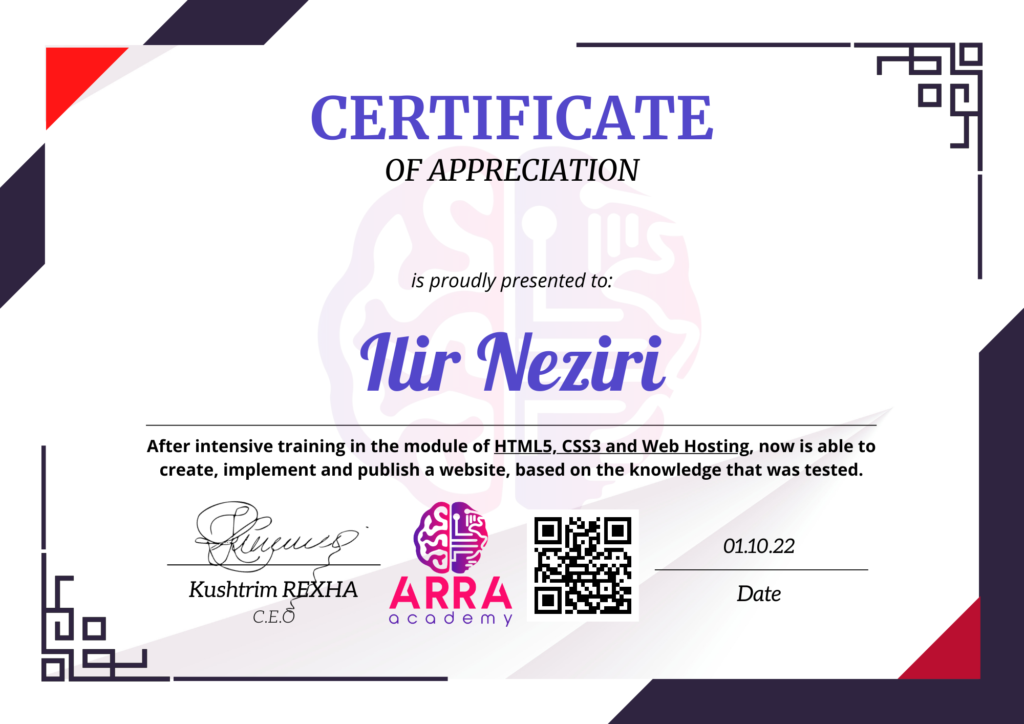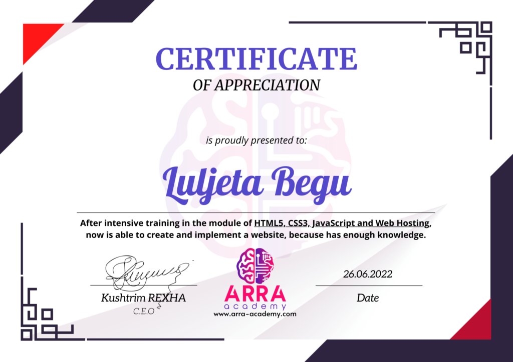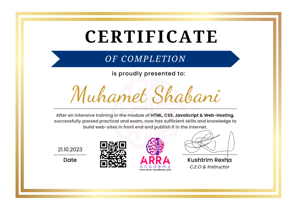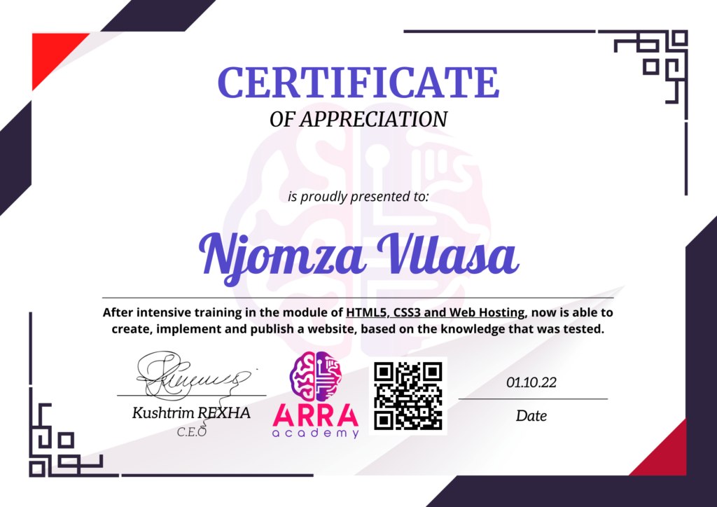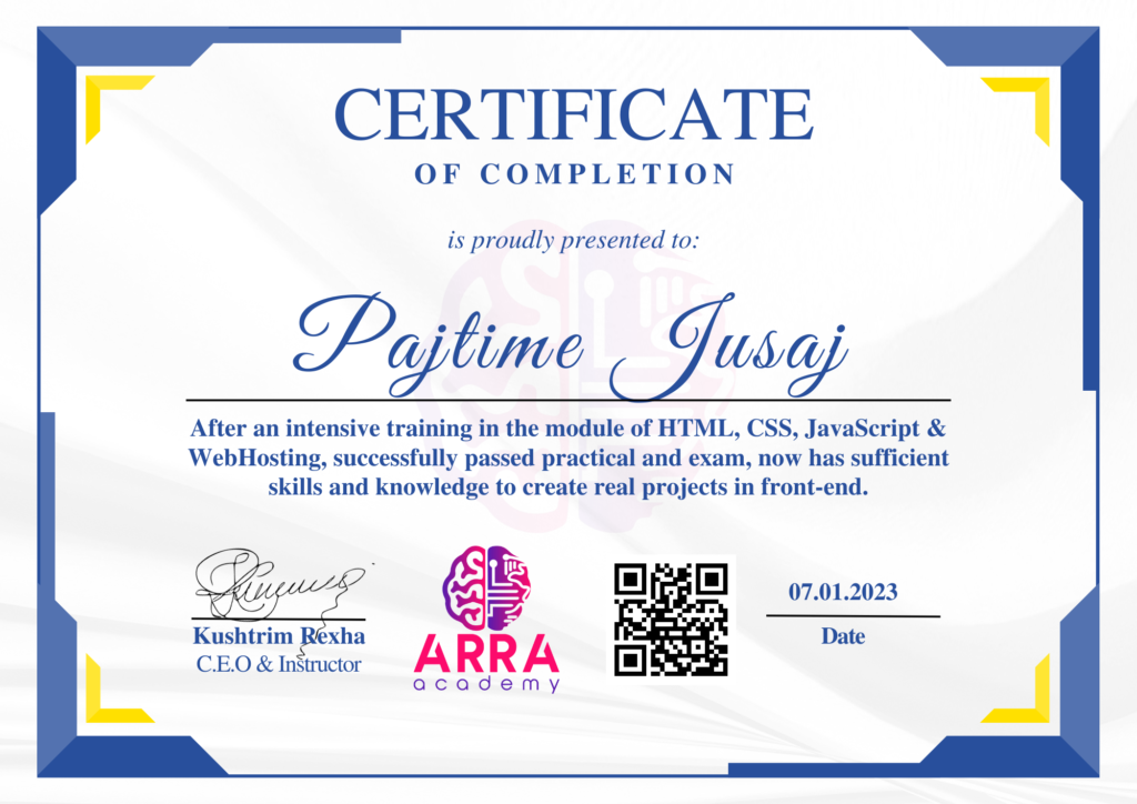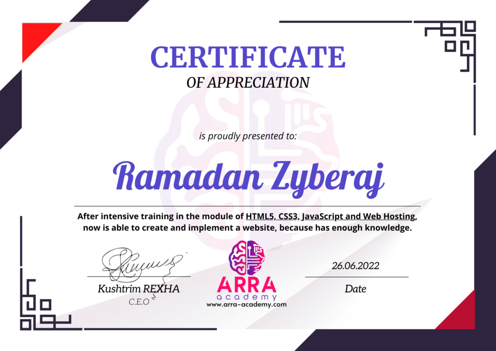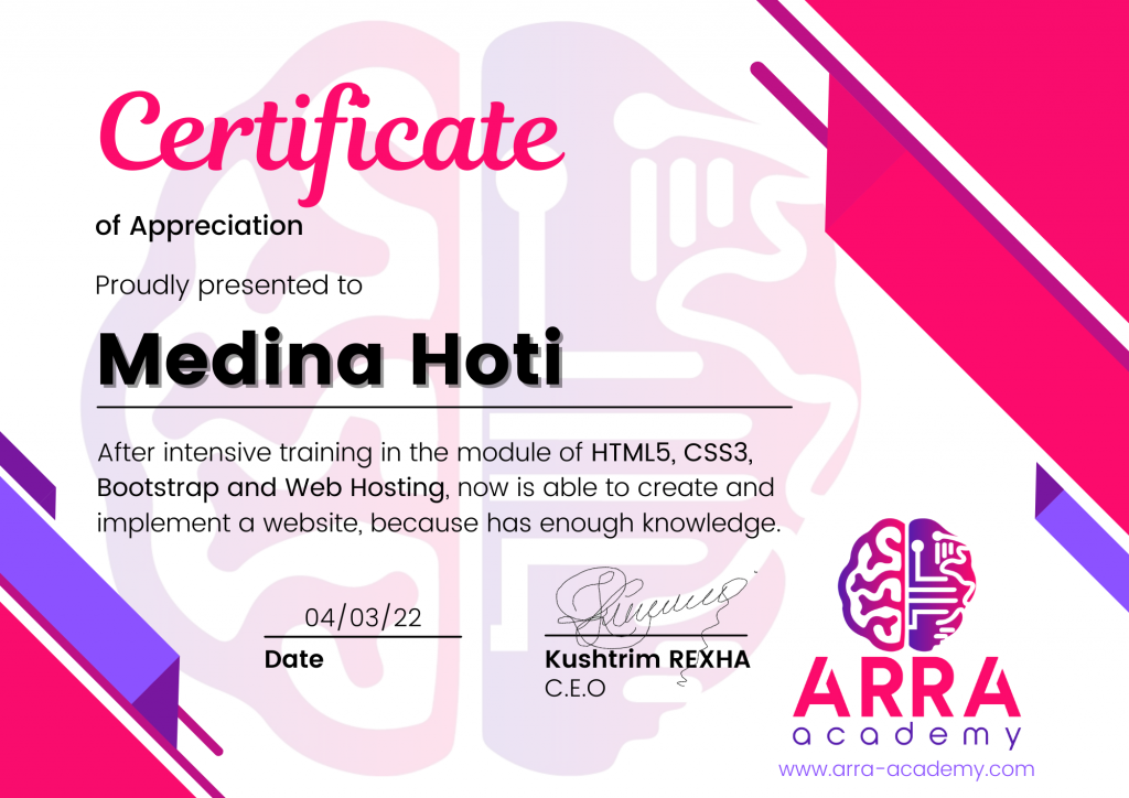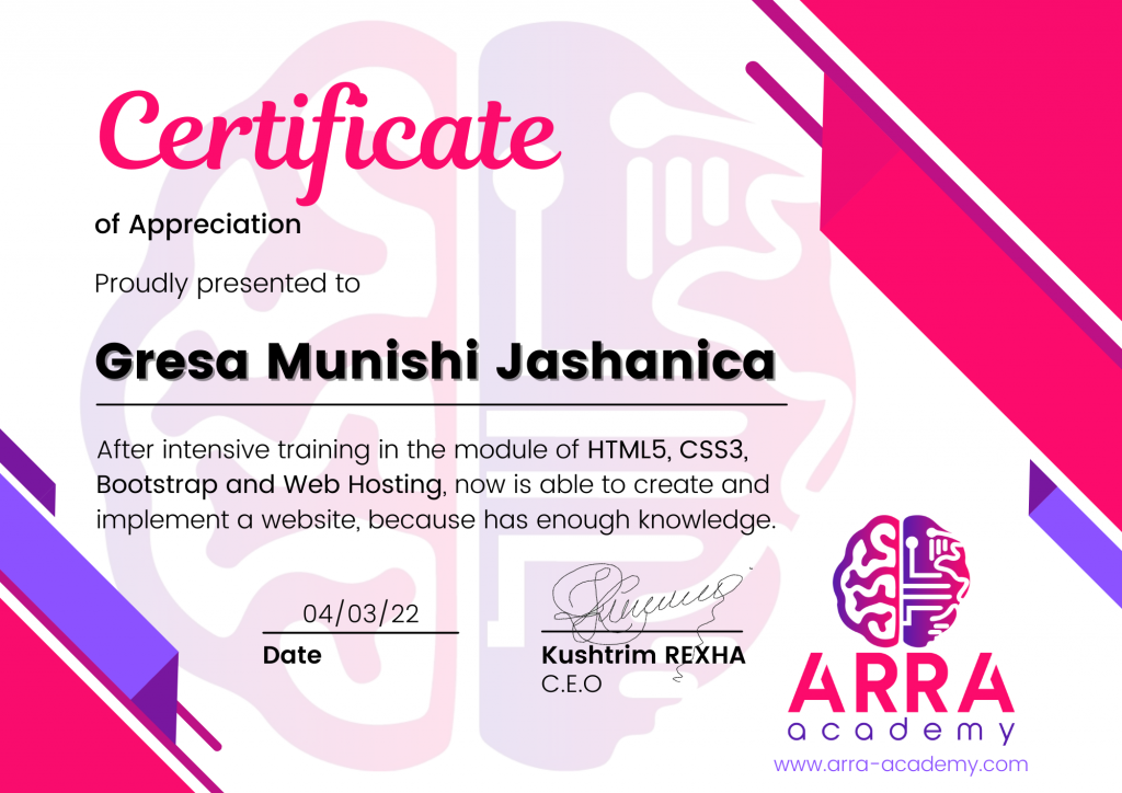Çertifikatat nga moduli HTML/CSS/JAVASCRIPT & WEB-HOSTING