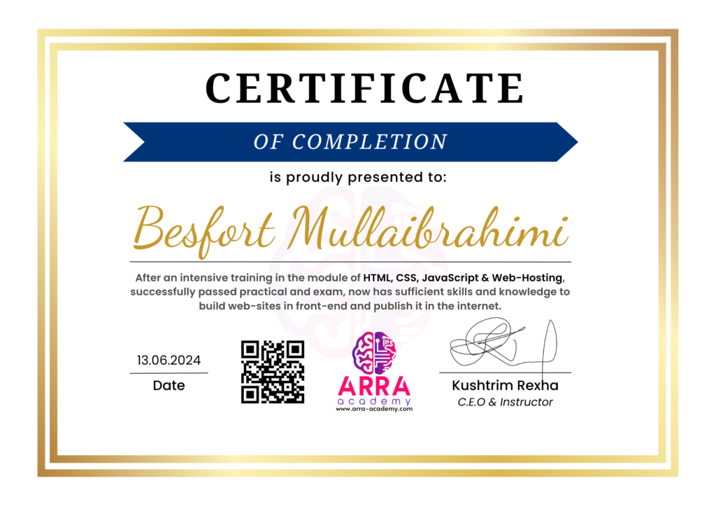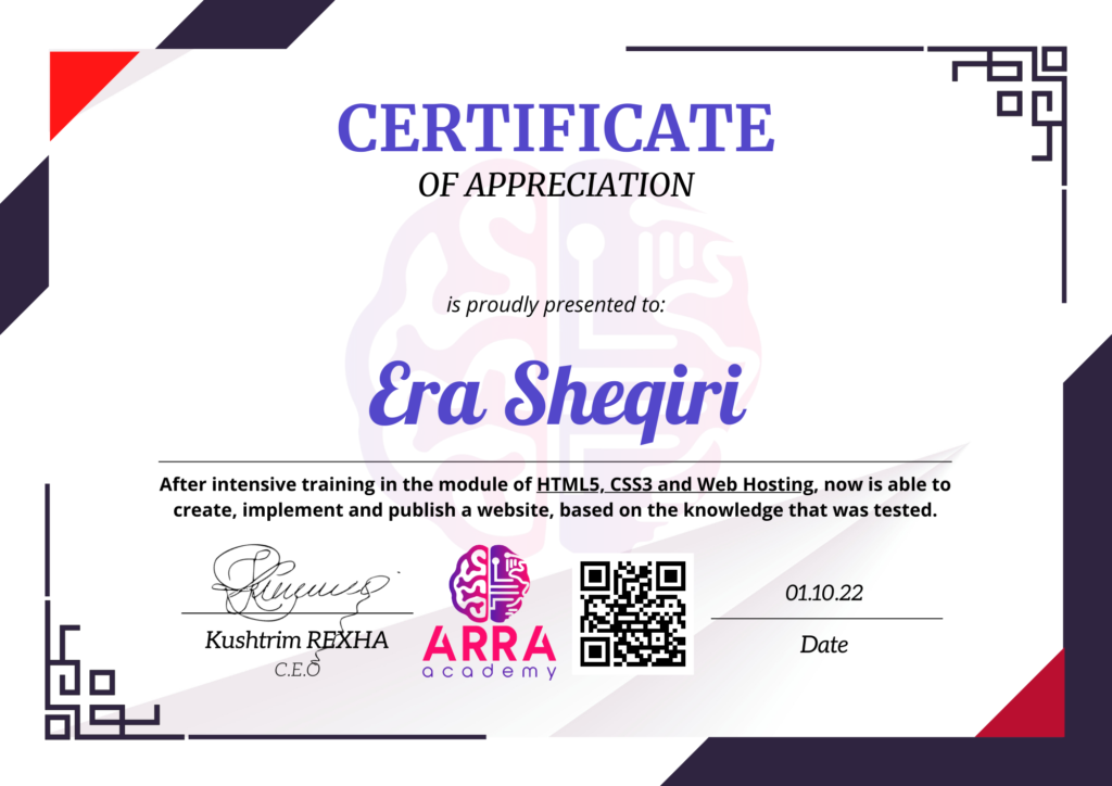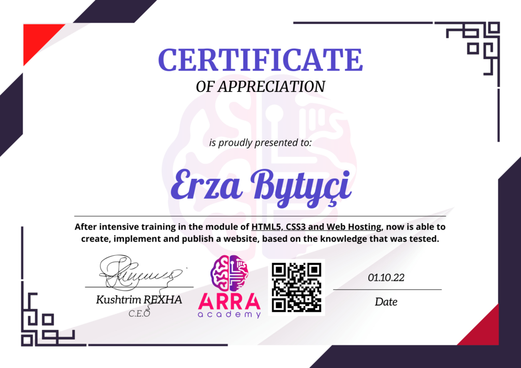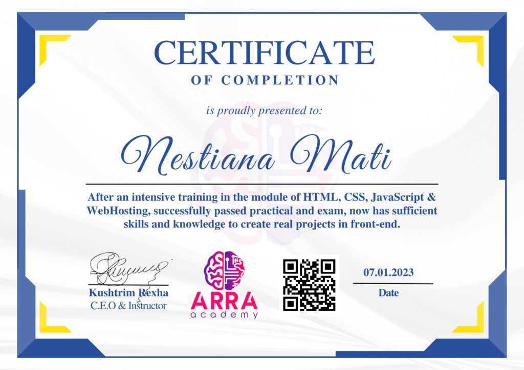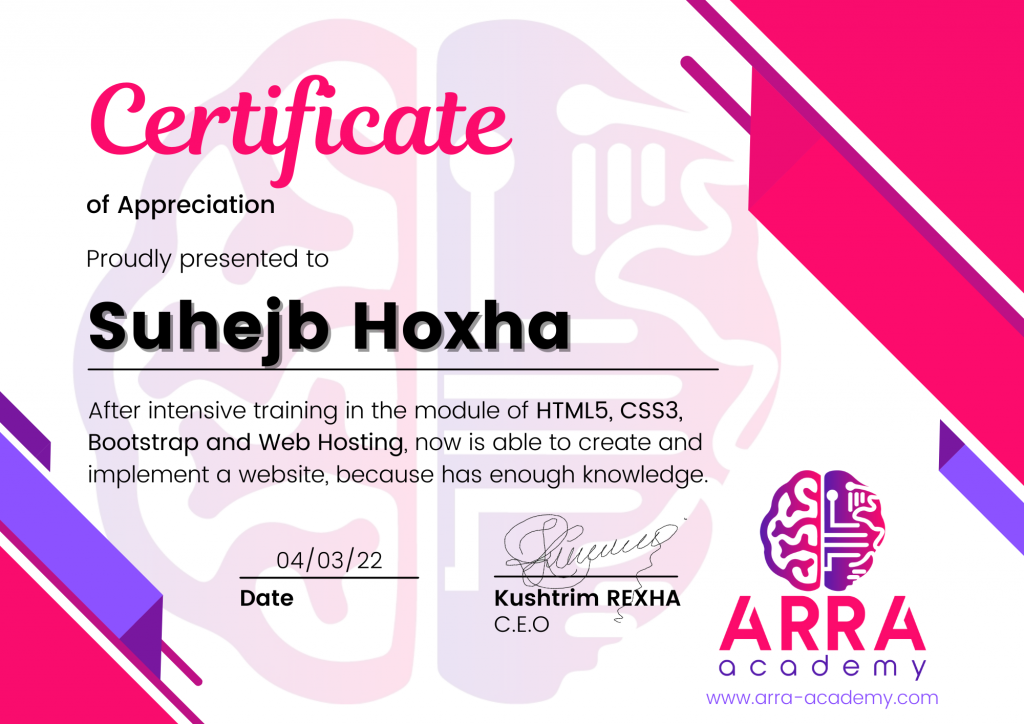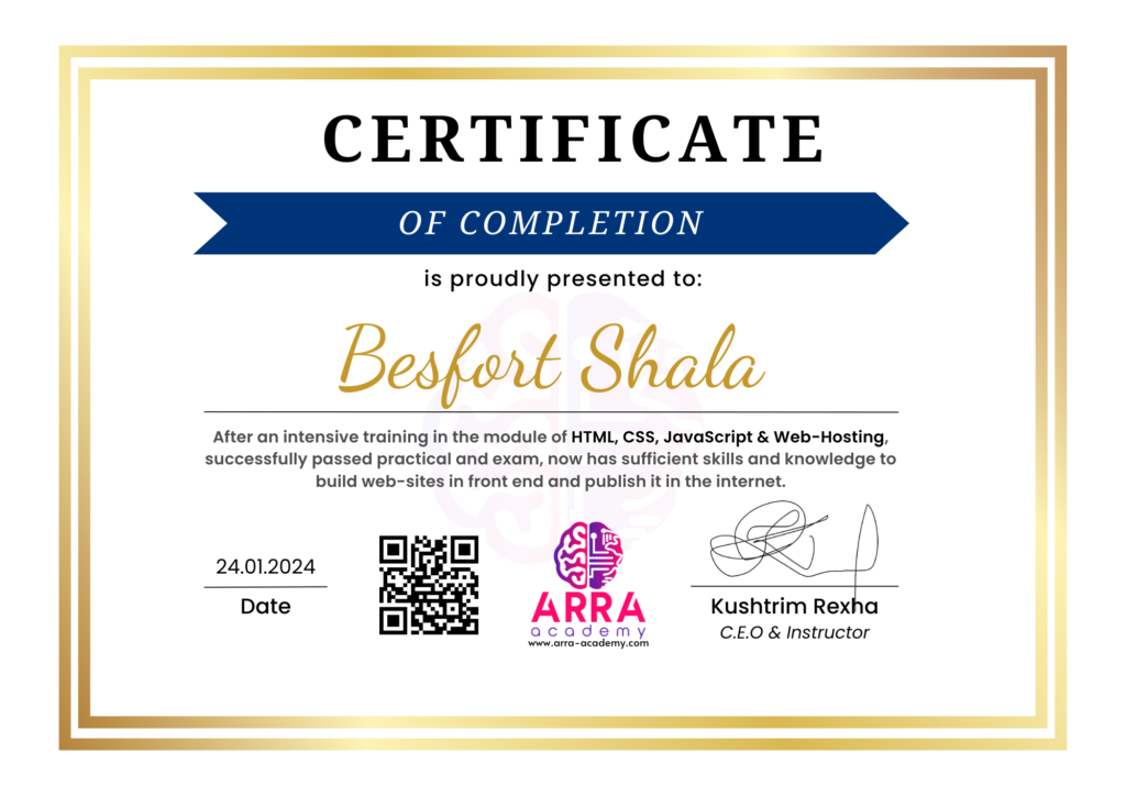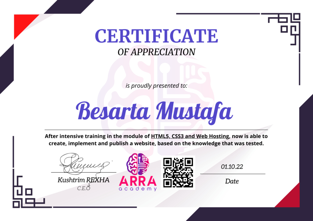 Çertifikatat nga moduli HTML/CSS/JAVASCRIPT & WEB-HOSTING