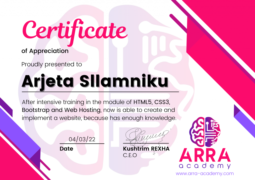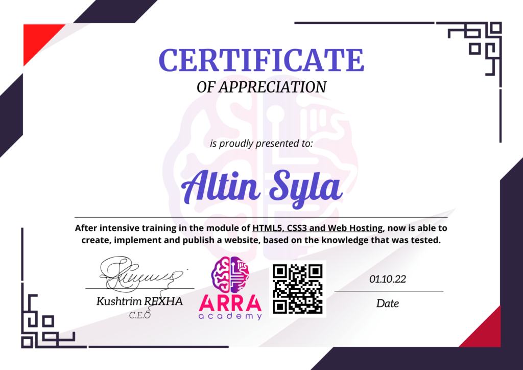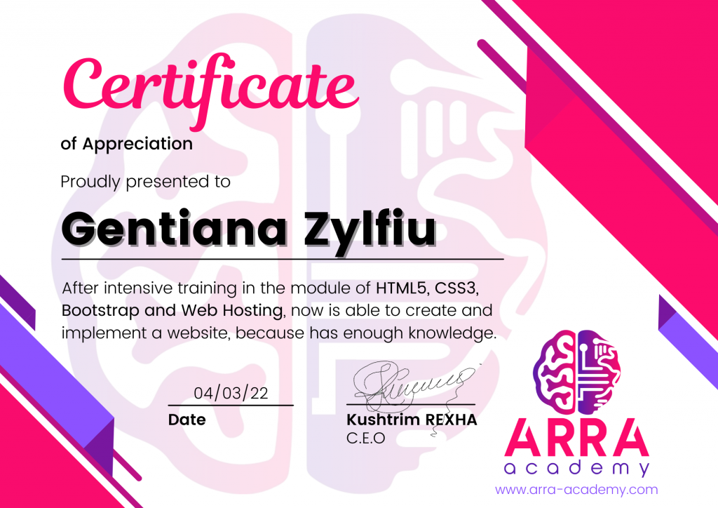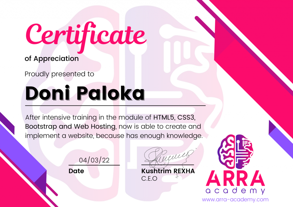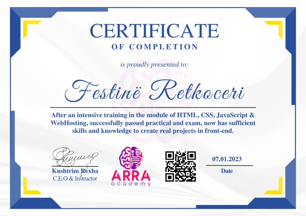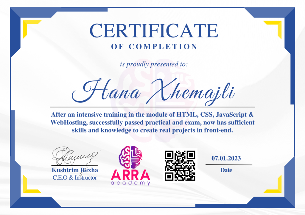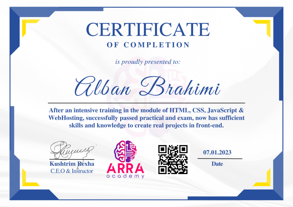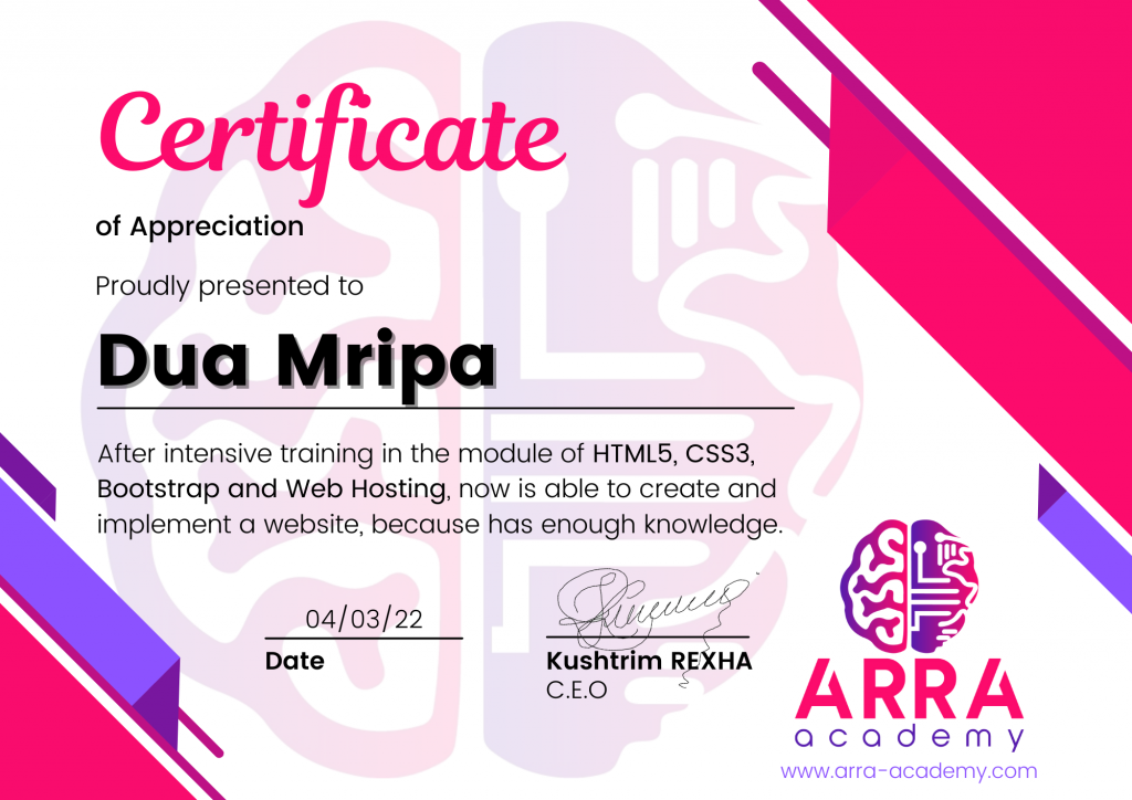 Çertifikatat nga moduli HTML/CSS/JAVASCRIPT & WEB-HOSTING