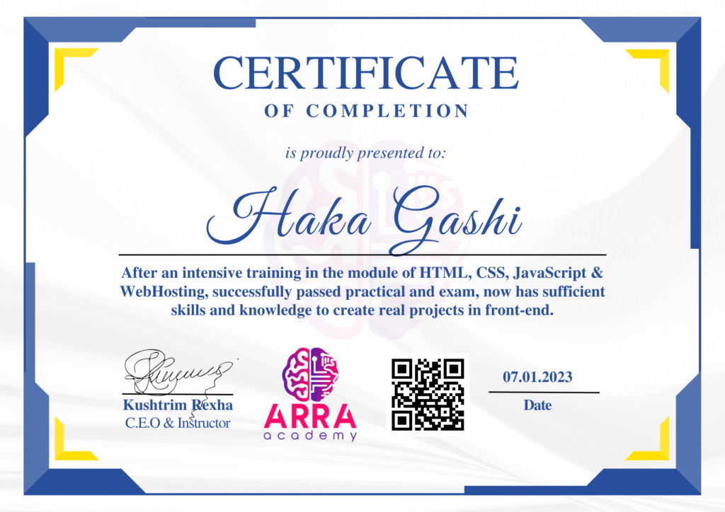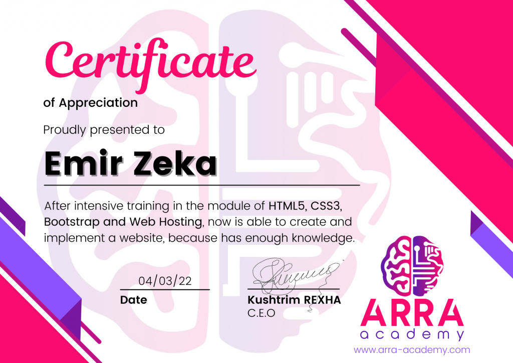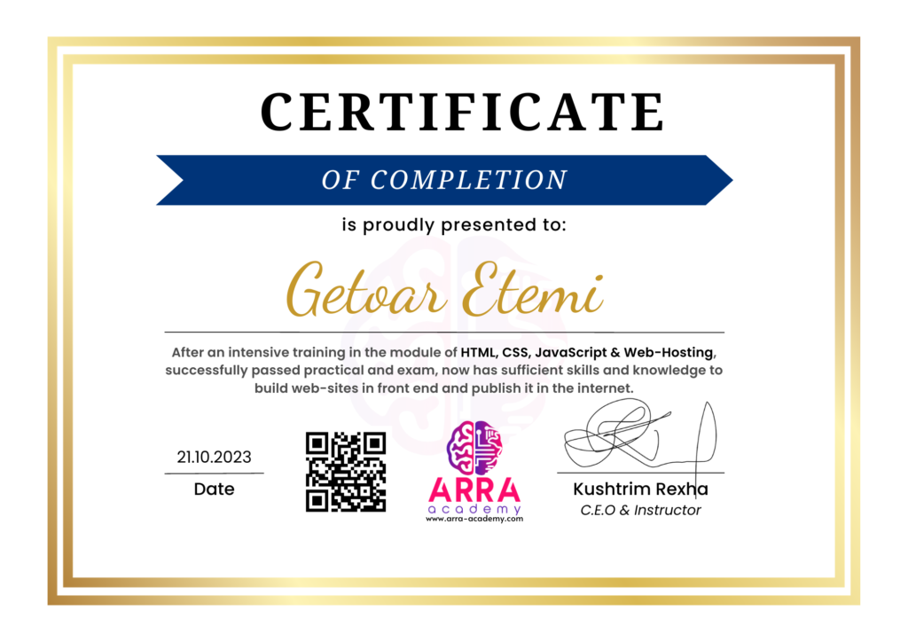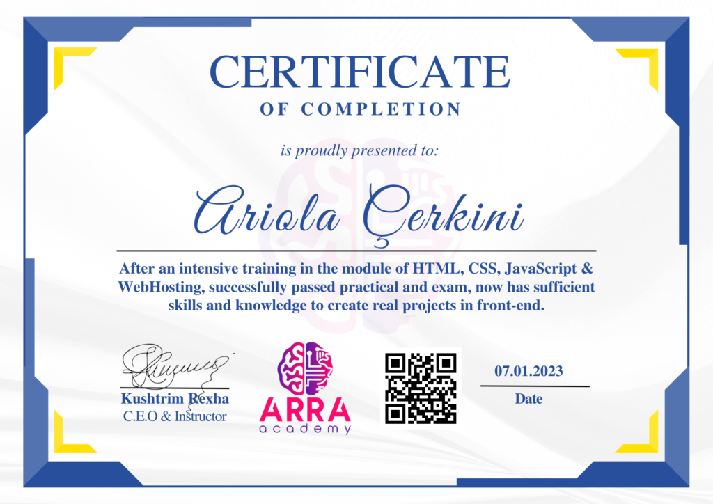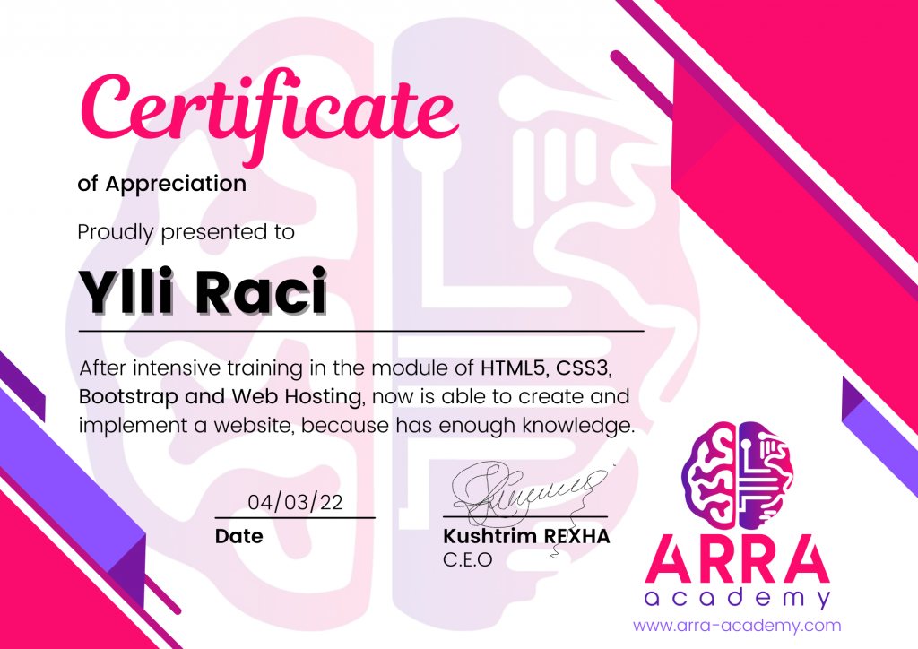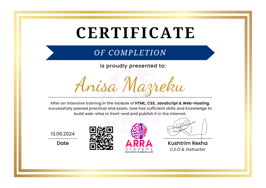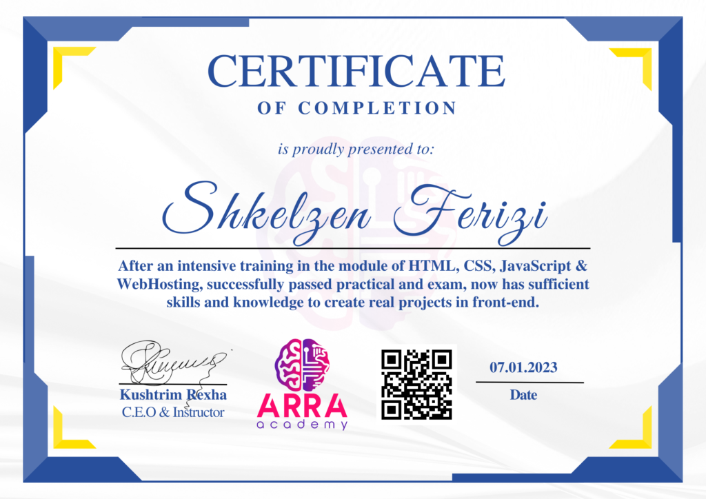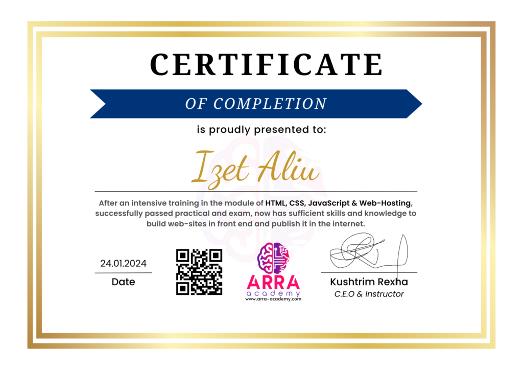 Çertifikatat nga moduli HTML/CSS/JAVASCRIPT & WEB-HOSTING