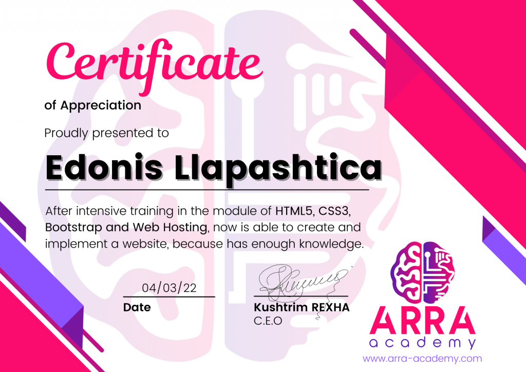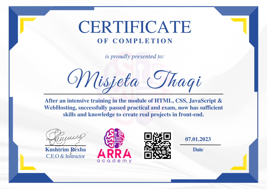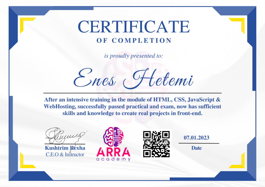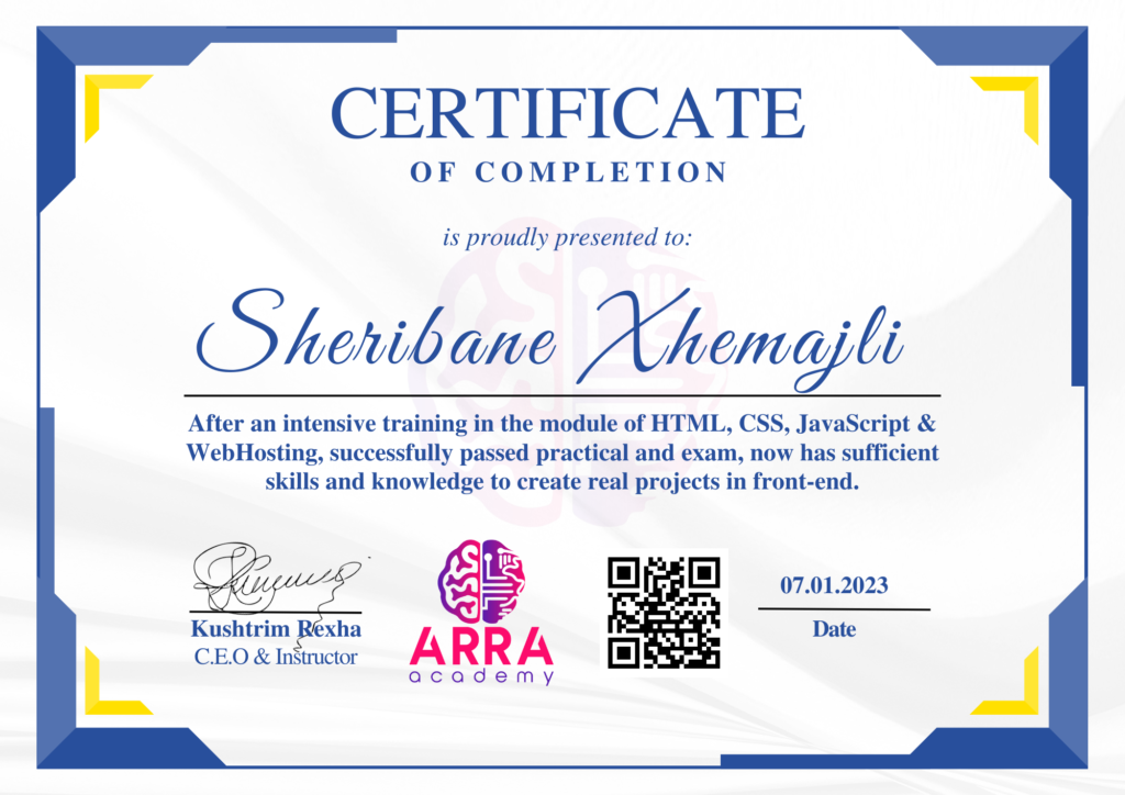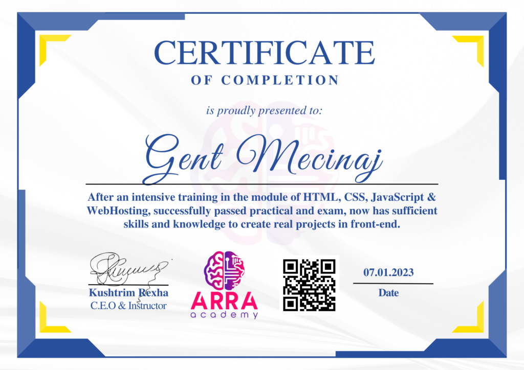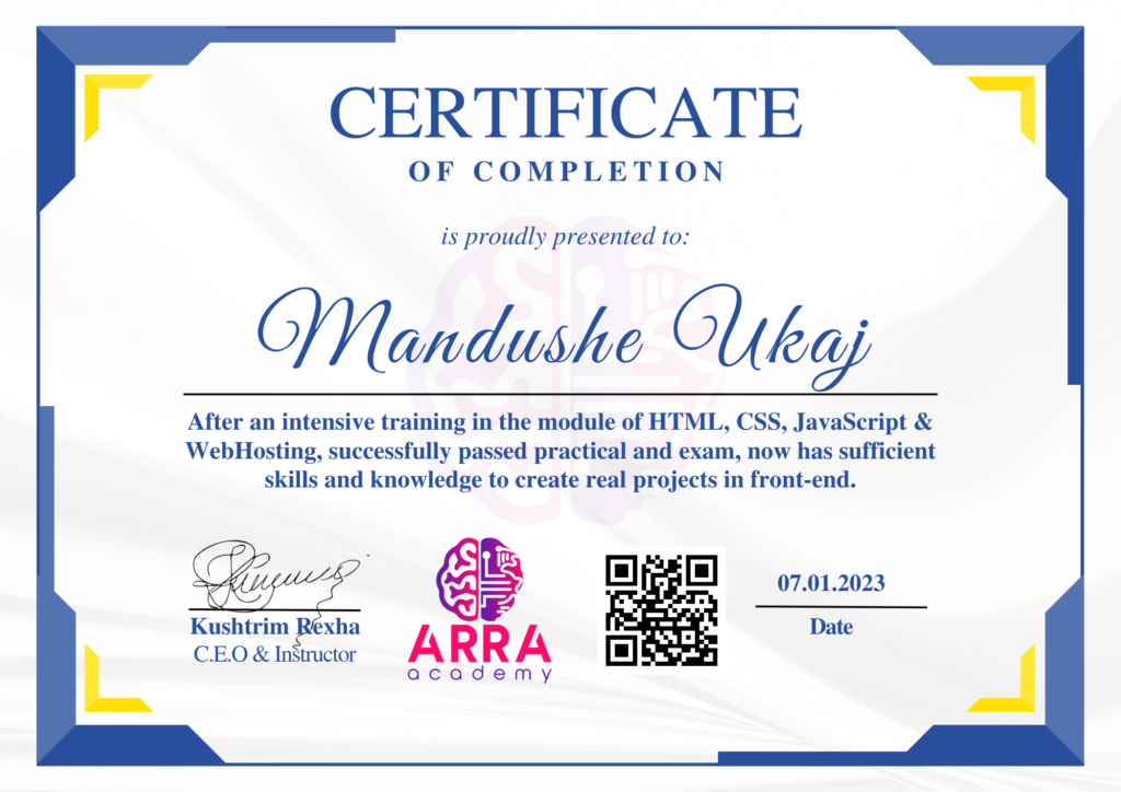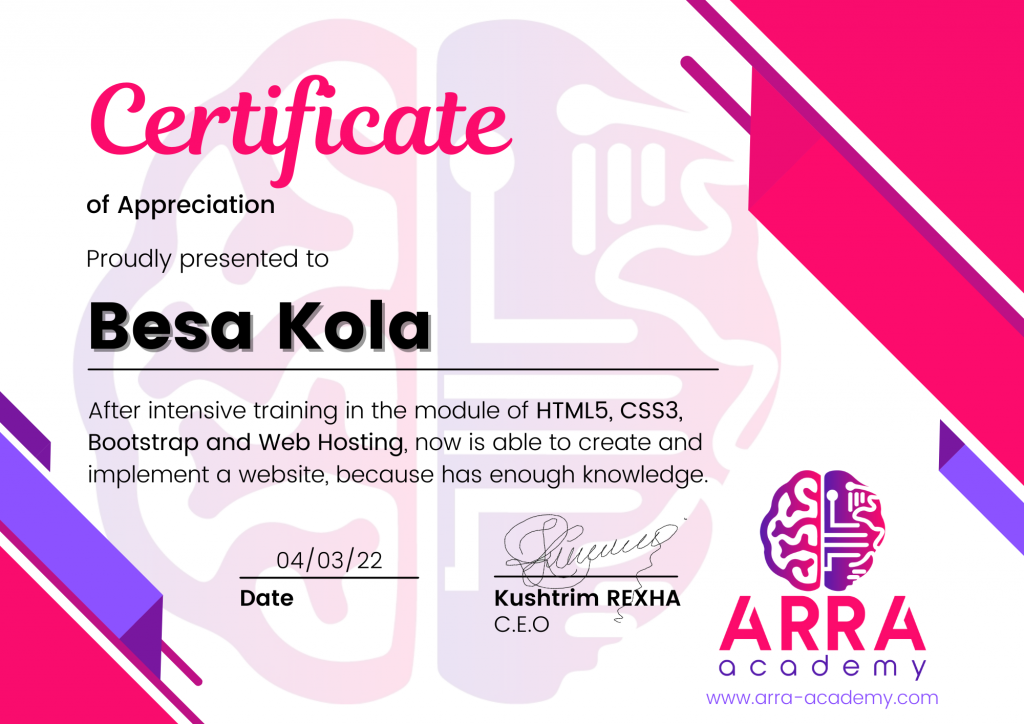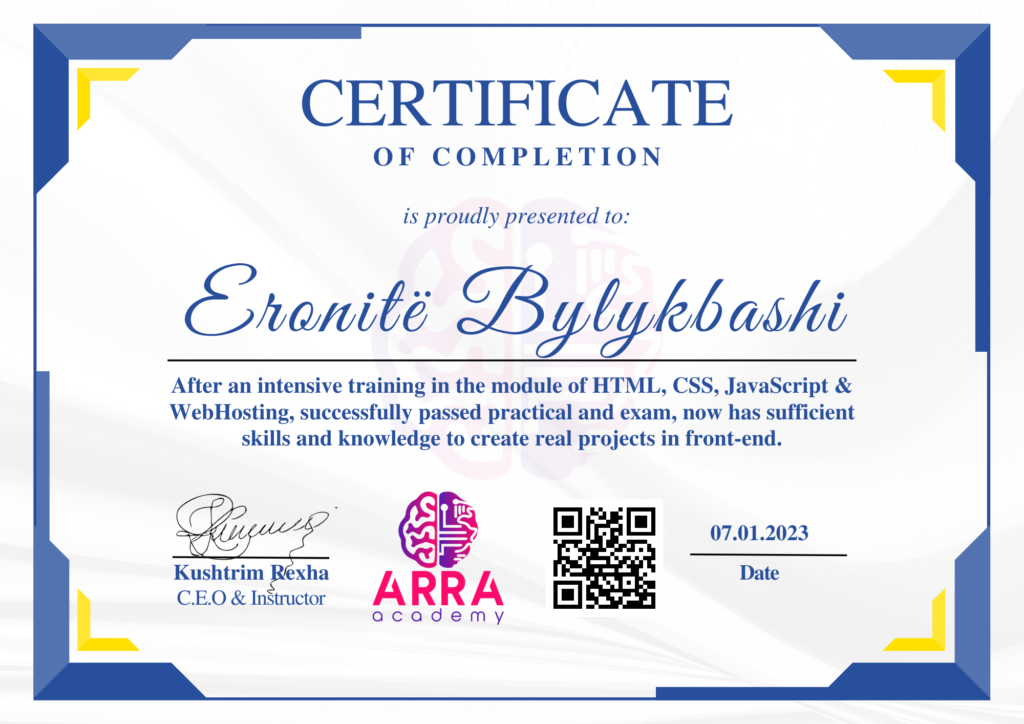 Çertifikatat nga moduli HTML/CSS/JAVASCRIPT & WEB-HOSTING